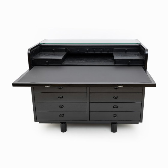 Seltenes und außergewöhnliches Schreibtischmodell Nr. 804, entworfen von Gianfranco Frattini für Bernini. Die ausziehbare Tischplatte gibt den Blick auf den Rollladen frei. Dieser Schreibtisch bietet viel Stauraum: 10 Schubladen vorne, mehrere Schubladen hinter der ausziehbaren Tischplatte und Regale für Bücher an der Rückseite. Er ist ein echter Blickfang und kann mitten im Raum platziert werden. In gutem Zustand.