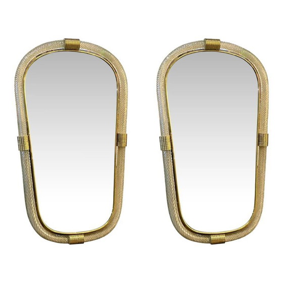 Paar italienische venezianische Murano-Glas-Wandspiegel mit elegantem Blattgold, gedrehtem Torciglione-Design und Details aus massivem Messing. Ideal für die Wandmontage in modernen oder zeitgenössischen Interieurs im Mid-Century-Stil. Jeder Spiegel ist mit hochwertigem Spiegelglas und einem handgefertigten Murano-Glasrahmen versehen.