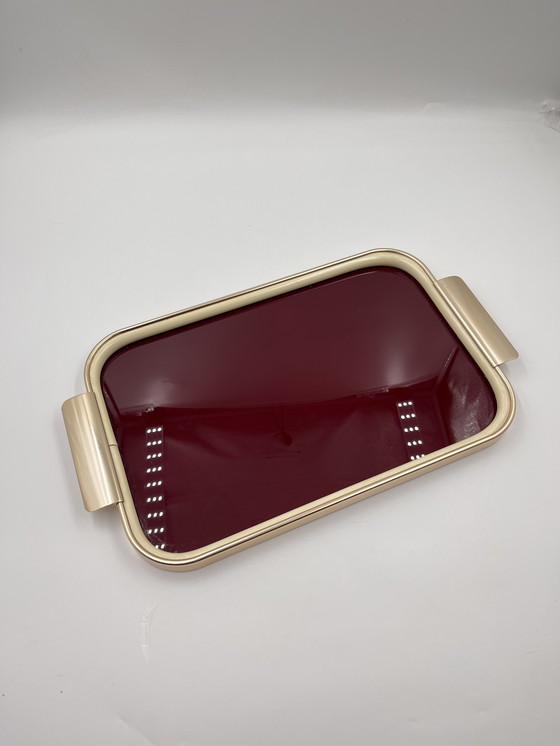 Wunderschönes Serviertablett aus den 1960er Jahren. Hergestellt aus vergoldeten Aluminiumkonturen auf einem bordeauxroten Hintergrund, der durch eine Glasscheibe der italienischen Manufaktur MB geschützt ist. In sehr gutem Zustand. Maße: 40 x 26 x H 3 cm.
