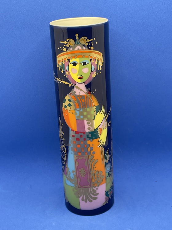 Diese Vintage-Vase von Bjørn Wiinblad, inspiriert von den zauberhaften Geschichten aus Tausendundeiner Nacht, ist ein wahres Farbenfeuerwerk. Gefertigt aus feinem Porzellan, besticht sie durch eine verspielte Figur, die um die Vase tanzt und Wiinblads unverkennbaren Stil mit filigranen Details und einer kräftigen Farbpalette perfekt widerspiegelt. Hergestellt von Rosenthal, ist dieses Stück nicht nur dekorativ, sondern ein Kunstwerk, das den Charme und die Kreativität des Mid-Century-Designs verkörpert. Verleihen Sie Ihrem Zuhause mit dieser einzigartigen Vase einen Hauch von Farbe und märchenhaftem Charme.