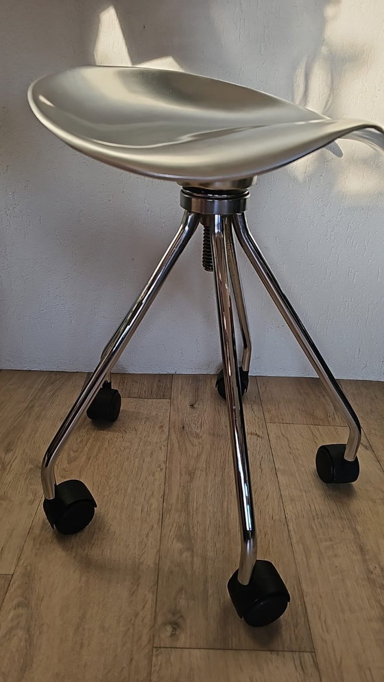 Hocker auf Rollen. Verchromtes Gestell, Aluminiumsitz. Sitzhöhe 43 cm, verstellbar bis 50 cm, Breite 43 cm, Tiefe 40 cm. Es handelt sich um die Originalausführung ohne Ring zwischen den Beinen. Der Stuhl ist in gutem Zustand und weist leichte Gebrauchsspuren auf. Die sattelförmige Sitzfläche ist 35,5 cm breit und 33,5 cm tief.