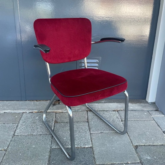 Dieser kultige Bürostuhl von Jan Schröfer für Ahrend ist ein wunderbares Beispiel für Vintage-Design. Vollständig neu gepolstert mit dem luxuriösen Manchester-Stoff von Keymer, strahlt der Stuhl mit seiner tiefroten Farbe Wärme und Stil aus. Der schwarze Lederbezug verleiht ihm ein elegantes und schlichtes Aussehen. Das verchromte Gestell und die bequemen Armlehnen machen ihn zu einem perfekten Designerstück für Heim und Büro. Ein einzigartiges Möbelstück mit Charakter, das sich in einem ausgezeichneten Zustand befindet.