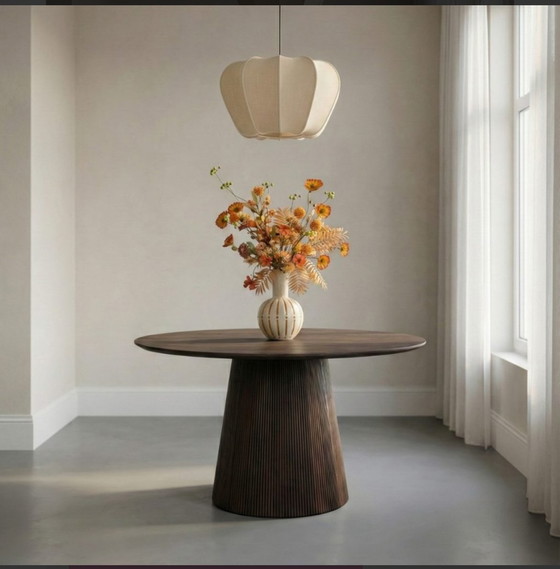 Erleben Sie die ruhige Schönheit des Japandi-Stils mit diesem eleganten runden Esstisch aus hochwertigem Mangoholz. Der dunkle Braunton verleiht jedem Esszimmer eine warme und einladende Atmosphäre, während das schlanke Design moderne Eleganz ausstrahlt. Dieser Tisch ist die perfekte Ergänzung für jedes Interieur und lädt zu langen, geselligen Mahlzeiten ein.
