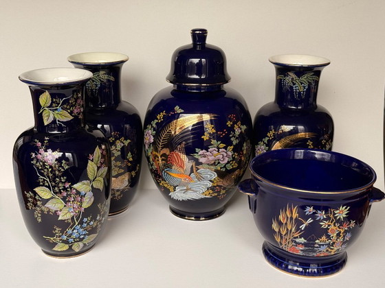 Erleben Sie die zeitlose Schönheit japanischer Kunstfertigkeit mit diesem atemberaubenden Set aus kobaltblauen Porzellanvasen und -schale. Jedes Stück ist ein Meisterwerk feinster Handwerkskunst und besticht durch detailreiche Verzierungen, die traditionelles japanisches Design verkörpern. Das tiefe Kobaltblau bildet die perfekte Grundlage für die lebendigen Blumen- und Vogelmotive, die elegant mit zarten Goldakzenten hervorgehoben werden.