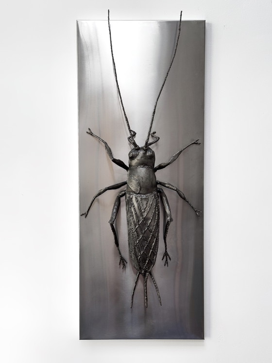 Mit ihren verlängerten Gliedmaßen, dem fein gegliederten Körper und den in lebensechter Spannung gehaltenen Fühlern zieht die Grille die Aufmerksamkeit auf sich, da sie sowohl ein Geschöpf der Natur als auch eine skulpturale Abstraktion darstellt. Die spiegelnde Qualität der Stahlplatte belebt das Werk mit wechselndem Licht und Reflexionen und verstärkt seine räumliche Dramatik. Dieses vom Künstler signierte und datierte Werk ist ein seltenes Exemplar aus der prägenden Zeit von Duval-Brasseurs Karriere.