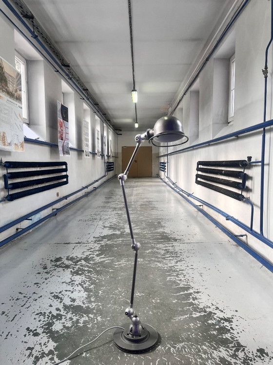 Ein Klassiker des französischen Herstellers Jieldé aus den 1950er-Jahren. In seiner jetzigen Form ist er 127 cm hoch. Mit ausgeklappten Armen ist er etwas größer. Die elektrischen Komponenten wurden erneuert. Es fehlt das Typenschild, aber eine Markierung deutet darauf hin, dass einst eines vorhanden war.