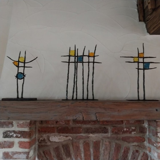 Surrealistische Skulpturen aus Schmiedeeisen, teils kombiniert mit Glas. Dies ist ein Triptychon, eine Darstellung unseres Sonnensystems. Miss Universe – Bruder Sonne, Mutter Erde, Schwester Mond und die Dreifaltigkeit. Die gelben, orangen und blauen Glasstücke symbolisieren Sonne, Erde und Mond. Diese einzigartige Figur entstand durch das Zusammenspiel von Hammer, Feuer und Amboss. Das 2 cm dicke, durchgefärbte, handgegossene Glas (Albertini) wurde von Hand zugeschnitten. Schmieden ist eine Form der Bildhauerei. Die vom Künstler verwendeten Materialien und Techniken fließen vollständig in das Ergebnis ein. Alle Skulpturen sind haptisch sehr ansprechend und gleichzeitig so vielschichtig, dass der Betrachter sofort nach der Botschaft und seiner persönlichen Verbindung dazu sucht. Einzigartiges, signiertes Werk aus dem Jahr 2025.