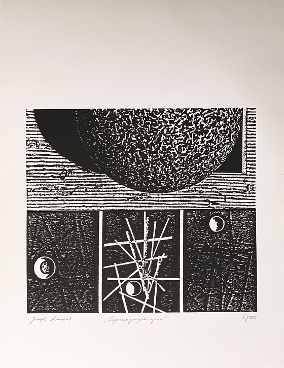 "espace graphique" schwarz-weißer serigrafiedruck von joseph Kadar (1936-2019) Mit Bleistift signiert. Flach versendet in einem Container aus extrudiertem Polystyrol. Joseph Kadar ist als Maler, Fotograf, Grafiker und Bildhauer bekannt. Er wurde am 25. Juli 1936 in Debrecen (Ungarn) geboren. 1965-1961 studierte er an der ungarischen Kunstuniversität unter Aurel Bernath und Geza Fonyi. 1939-1954 lebte Kadar in Hajduszoboszlo, 1969 zog er nach Paris. Seine frühe Pariser Zeit wurde vom Surrealismus, Konstruktivismus und in gewissem Maße auch vom Abstraktionismus beeinflusst. Der Künstler definierte 1973 als den Beginn seiner Periode des "Dualismus", 1984 als den Beginn der Periode des "Horizontalismus". 1969 schuf er seine ersten Mail-Art-Objekte und seine ersten Buchobjekte. Ab 1979 beschäftigte sich kadar ernsthaft mit Kunstfotografie. In einer Reihe von Fotografien und Fotogrammen hielt er Eindrücke von seinen Reisen nach Israel, Indien, Italien, Griechenland und Spanien fest. Diese Werke wurden von Lucien Hervé, (französischer Fotograf ungarischer Abstammung) sehr geschätzt. Zur gleichen Zeit begann Kadar mit der Elektrographie zu experimentieren. In den frühen 1980er Jahren schuf er Kunstobjekte mit einem Fotokopierer, wobei er auch Fotografien und Collageelemente verwendete. 1985 verließ kadar die Malerei, um seine Forschungen zu den Methoden des Fotokopierens und der Elektrografie mit dem Computer (schwarz-weiß sowie Farbe) zu vertiefen. Er arbeitete auch mit verschiedenen nicht reproduzierbaren Techniken (wie der dreidimensionalen Relief-Elektrografie).