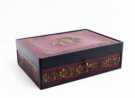 Antike Schachtel aus gekochter Pappe und Leder, Italien 1960/70 Diese Schachtel hat einen unglaublichen Charme und wird Ihrer Dekoration einen hübschen Hauch von Geschichte verleihen. Dieses schöne Deko-Objekt und nützlich für kleine Aufbewahrungen im Büro oder im Eingangsbereich. Jugendstil-Dekor auf Leder gepresst, italienische Herstellung Florenz. Farbe Bordeaux, Schwarz und Gold. Beachten Sie Gebrauchs- und Zeitspuren. Tintenspuren auf dem Innendeckel. Funktionstüchtiger Schlüssel Siehe Fotos Maße: Seiten 26x19cm Höhe 8cm Zögern Sie nicht, mich über den Nachrichtendienst zu kontaktieren, wenn Sie Fragen haben oder weitere Fotos wünschen.
