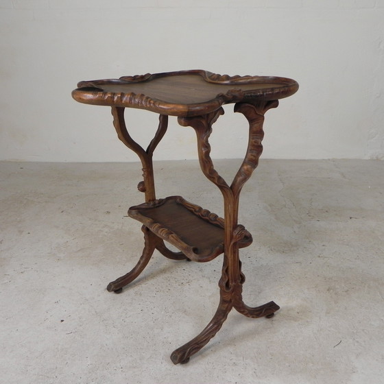 Ursprünglich waren die 2 Plateaus (oben und unten) mit einer Landschaftsdarstellung in Intarsienholz versehen.