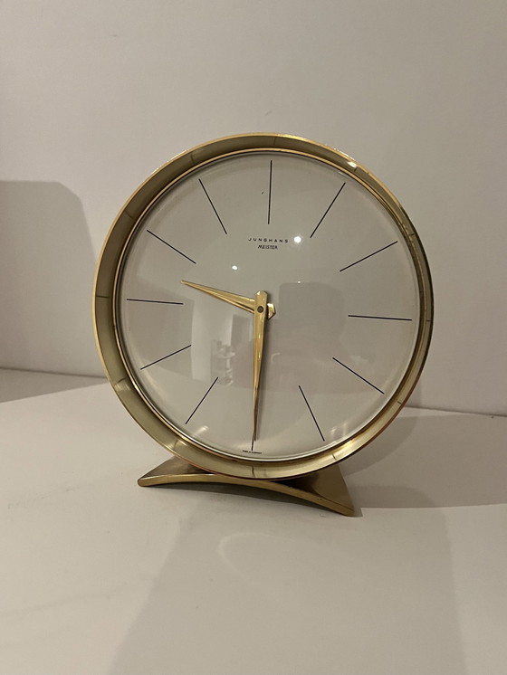 Wunderschöne Junghans Meister Tischuhr in gutem Zustand. Diese Vintage-Uhr ist ein echter Hingucker und eine stilvolle Ergänzung für jedes Interieur. Das minimalistische Design und die hochwertige Verarbeitung machen sie zu einem begehrten Sammlerstück. Die Uhr ist funktionsfähig und in altersgemäß gutem Zustand. Bitte sehen Sie sich die Fotos für einen guten Eindruck an. Junghans Meister Tischuhr. Diese mechanische Uhr, hergestellt in Deutschland, hat ein goldfarbenes Messinggehäuse.