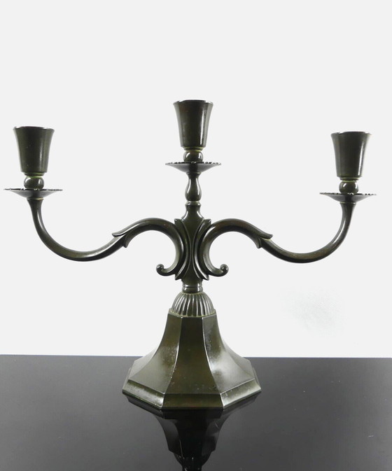 Just Andersen Kerzenleuchter aus den 1930er Jahren. Disko Metall, ähnlich Bronze. Länge ca. 30 cm. Höhe ca. 23 cm. Fuß ca. 11 x 11 cm. Gewicht ca. 1421 Gramm. Gemarkt am Boden: Firmenzeichen Danmark 155.