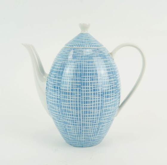 Kaffeekanne aus weißem Porzellan mit blauem Dekor. Entwurf von Heinrich Löffelhardt für Arzberg Porzellan, 1954.