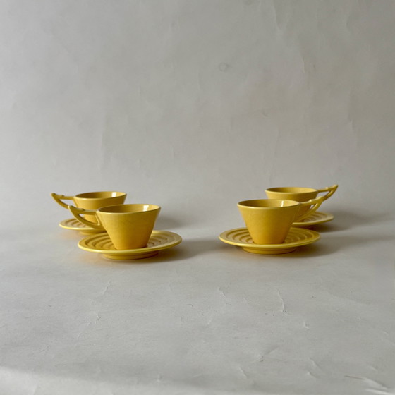 Postmodernes Kaffeeservice, das von Pierre Casenove entworfen und in den 1980er Jahren von Studio Salins herausgegeben wurde. Es besteht aus vier Kaffeetassen, alle aus gelb glasierter Keramik, die mit ihren Schalen sehr grafisch und von der Memphis-Bewegung inspiriert sind.