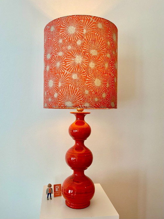 Diese perfekt erhaltene Stehlampe im Space-Age-Stil stammt vom renommierten deutschen Leuchtenhersteller Kaiser Leuchten, einem bekannten Hersteller zeitlosen Mid-Century-Designs mit frischem, modernem Look. Der Keramikfuß mit der markanten, skulpturalen Dreikugelform – auch bekannt als Bubble Lampe – ist typisch für die Lampen, die Kaiser Leuchten in den 1960er- und 1970er-Jahren produzierte. Die besonders leuchtende rote Glasur mit subtilen dunklen Untertönen macht sie zum Blickfang in anspruchsvollen Interieurs. Der Fuß der Bubble Lampe befindet sich in exzellentem Originalzustand und wurde mit einem neuen, maßgefertigten Schirm versehen. Der japanische Baumwollstoff mit grafischem Sonnenmuster in leuchtenden, natürlichen Orangetönen besteht aus einer hochwertigen Baumwoll-Leinen-Mischung, die perfekt mit der Farbpalette des Fußes harmoniert. Im eingeschalteten Zustand spendet die Lampe ein warmes und lebendiges Licht.