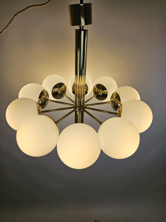 Verleihen Sie Ihrem Interieur mit dieser wunderschönen Pendelleuchte von Kaiser Leuchten einen Hauch von Eleganz. Mit ihren zehn milchig-weißen Glaskugeln und dem edlen Messingfuß verströmt diese Leuchte zeitlosen Charme und fügt sich perfekt in klassische wie moderne Räume ein.