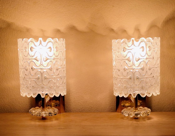 Die Leuchten bestehen aus massivem, gepresstem Strukturglas mit einem markanten organisch-geometrischen Wellen-/Labyrinthmuster, das typisch für Kalmar-Entwürfe der 1960er- und 1970er-Jahre ist. Das Glas sorgt für ein besonders warmes, atmosphärisches Lichtbild an der Wand.