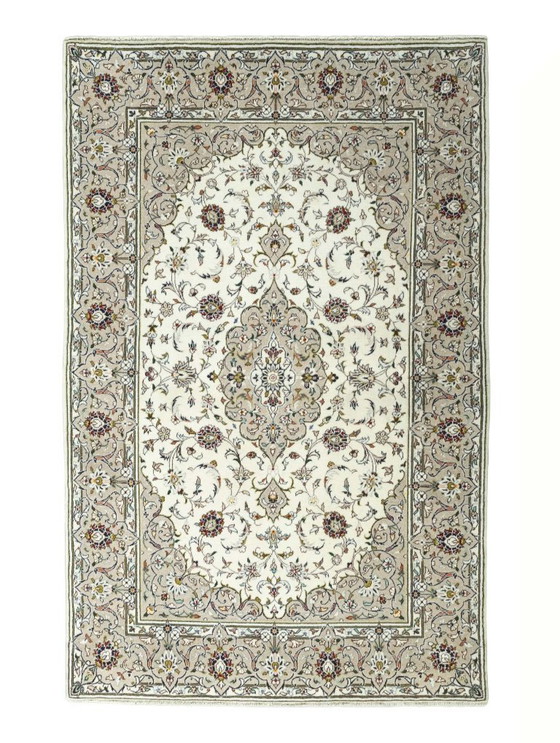 Dieser klassische Kashan Orientteppich besticht durch seine helle, elegante Erscheinung. Die Komposition aus floralen Ranken, Blüten und einem stilisierten Mittelmedaillon entfaltet sich auf einem elfenbeinfarbenen Hintergrund mit zarten Beige- und Bordeaux-Akzenten. Die ausgewogene Gestaltung und feine Handarbeit machen diesen Teppich zu einem zeitlosen Schmuckstück – ideal für stilvolle Wohnräume.