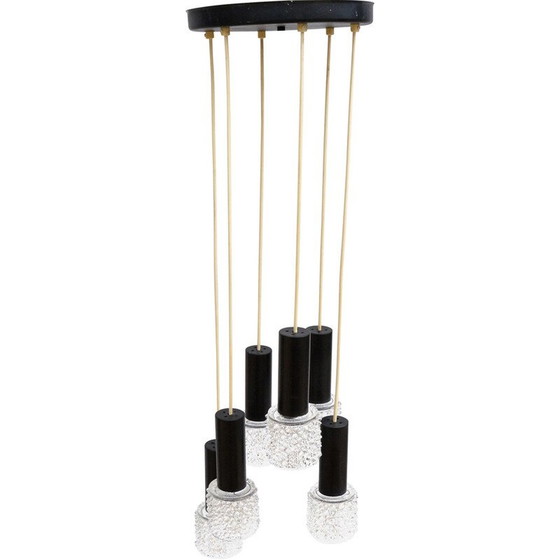 Erhellen Sie Ihre Räume mit der zeitlosen Eleganz dieses Vintage-Kaskadenleuchters von Elektroinstala Jilove, gefertigt in den 1970er-Jahren in der Tschechoslowakei. Dieses exquisite Stück besticht durch fünf Kristallglasschirme, die durch schwarze Stahlelemente harmonisch ergänzt werden und einen markanten Kontrast bilden, der jedes Interieur aufwertet.