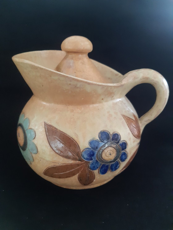 Sehr hübsche Kanne mit Deckel des belgischen Keramikers Fernand Dubois (1861-1939) mit floralem Motiv. Maße Breite: ca. 19 cm, Tiefe ca. 16 cm, Höhe ca. 18 cm (ca. 16 cm ohne Deckel). Der Künstler hat den Krug handsigniert und mit "S 94" bezeichnet. Der Krug ist von recht guter Vintage-Qualität mit drei kleinen Beschädigungen, nämlich einem kleinen Chip am Deckelrand, der beim Aufsetzen des Deckels nicht sichtbar ist, einem kleinen Chip am Schüttrand und einem winzigen, fast unsichtbaren Chip neben einem Blattmotiv. Fernand Dubois war ein persönlicher Freund von Victor Horta, der F. Dubois' Jugendstilhaus mit Atelier (Forest, Brüssel) entworfen hat.