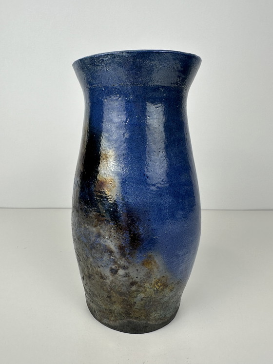 Keramikvase. Blaue Flammenglasur. Signiert: Dédé. Belgisch. Die Vase weist am Rand einen kleinen Fehler auf. Dieser entstand in der Werkstatt, da die Glasur nachträglich aufgetragen wurde. Auf dem Detailfoto ist er gut zu erkennen. Höhe: 19,5 cm. Durchmesser: 10 cm. Gewicht: 870 g.