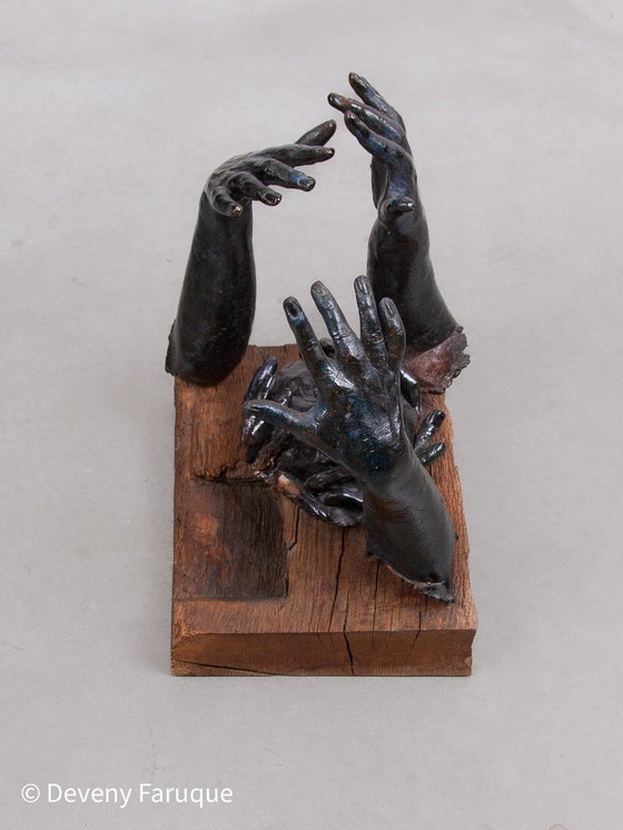 Eine schöne Skulptur mit drei gut geformten Händen um ein Gesicht, das mit der Holzstatue in tiefblauer Glasur mit grünen Nuancen verbunden ist. Die handgefertigte Skulptur stammt aus den 1970er Jahren und wurde von einem unbekannten Künstler aus Belgien entworfen.