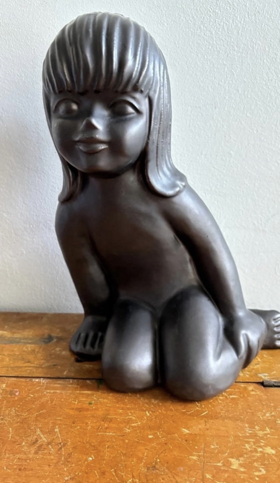 Keramik, Keramik, schwarze glatte Steingut-Skulptur, Figur sitzendes Mädchen, bildender Künstler Emiel Laskaris, vom Künstler mit den Initialen E.L. gekennzeichnet. 1960s. Griechischer Künstler, tätig zwischen den 60er und 80er Jahren.