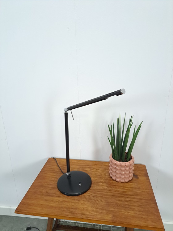 Die schwarze Schreibtischlampe ist in gutem Zustand, mit Gebrauchsspuren, die ihrem Alter entsprechen. Die Lampe wurde vollständig überprüft und funktioniert gut. Die Lampe funktioniert mit einem Transformator. Es gibt einige Kratzer rund um die Lampe. An der Unterseite der Lampe, wo die Glühbirne brennt, gibt es eine Beschädigung des Metalls.
