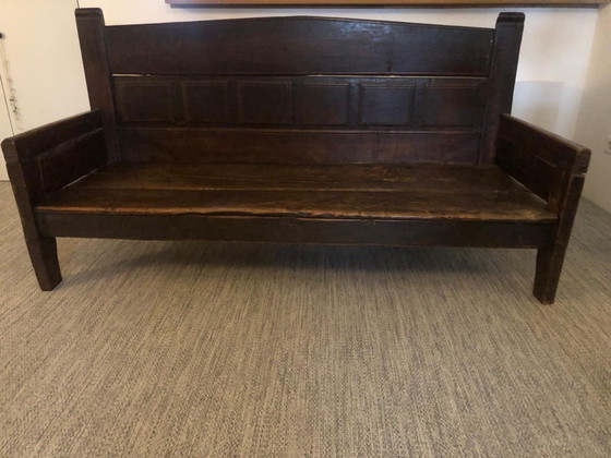 Eine wunderschöne antike Bank aus massiver Eiche. Diese Bank ist ein echter Blickfang und versprüht Charakter und Authentizität. Sie passt perfekt in Flur, Wohnzimmer oder auf die Veranda. Für ihr Alter ist die Bank in gutem Zustand und hat eine schöne Patina. Maße: 180 x 68 x 93 cm.