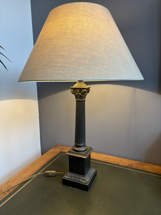 Diese klassische Lampe mit Leinenschirm strahlt Eleganz und Raffinesse aus. Die Lampe hat einen robusten Metallsockel (Bronze?) mit einem detaillierten Design, das an klassische Architektur erinnert. Der Leinenschirm spendet ein weiches, warmes Licht, das sich perfekt in jeden Raum einfügt. Diese Lampe ist ideal für den Schreibtisch oder Beistelltisch und verleiht Ihrer Einrichtung einen Hauch von zeitlosem Charme.