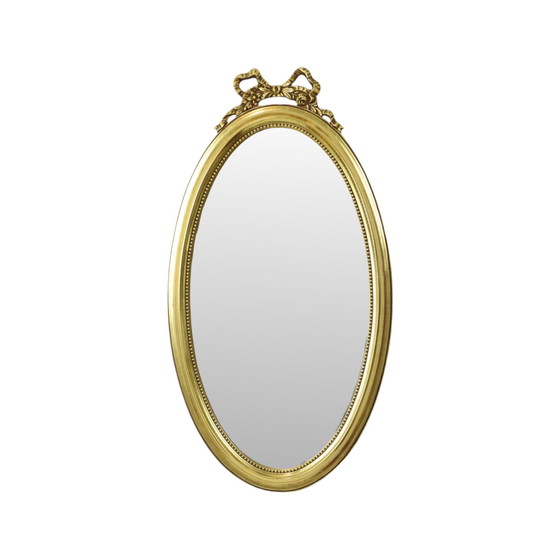 Ovaler Goldspiegel im klassischen Louis-XVI-Stil, oben mit einem Band und einer Schleife verziert, aus Holz und Harz, ca. Mitte 20. Jahrhundert, Frankreich.