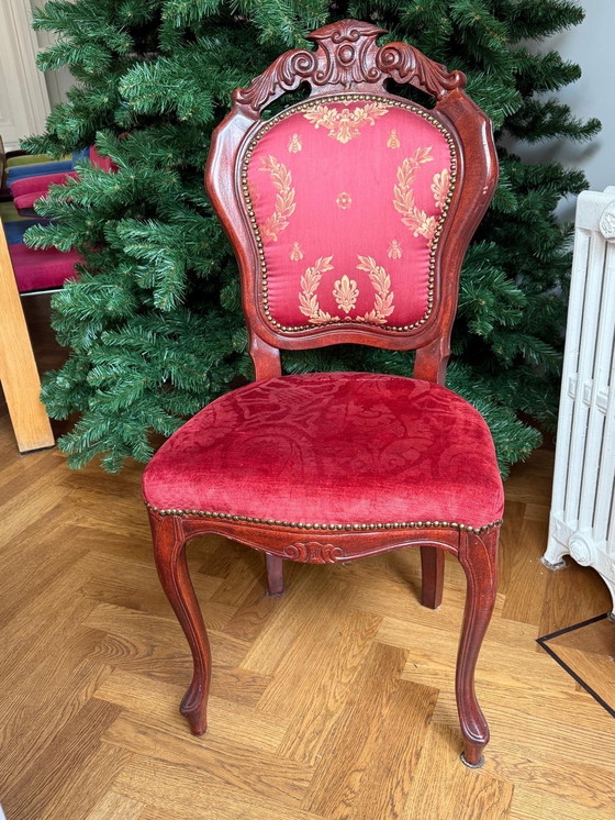 Wunderschöner antiker Stuhl mit aufwendigen Schnitzereien und erhabener Ausstrahlung. Der Stuhl besitzt ein stabiles Holzgestell mit elegant geschwungenen Beinen und einer kunstvoll geschnitzten Rückenlehne. Der Bezug besteht aus tiefrotem Stoff mit Goldstickerei an der Rückenlehne und einem weichen Samtsitz.