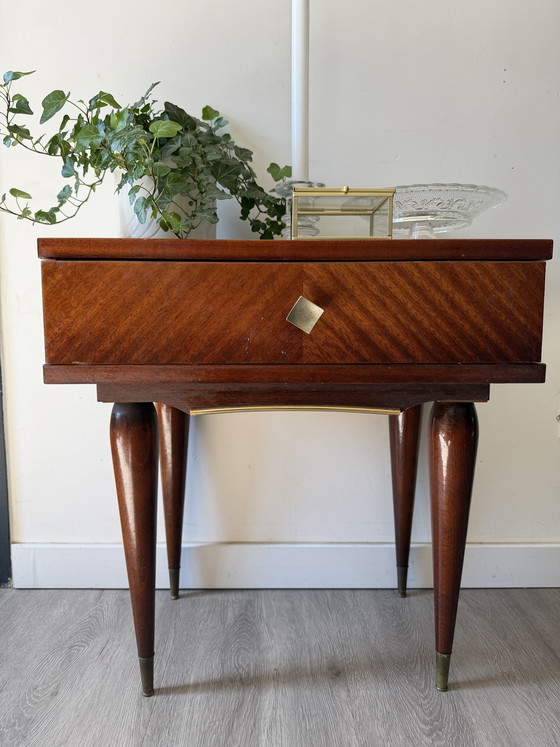 Wunderschöner Vintage-Beistelltisch mit einer Schublade. Warmes Holz mit schöner Maserung auf der Vorderseite und schlanke, sich verjüngende Beine mit Messingdetails. Die Schublade hat einen quadratischen Griff und lässt sich leichtgängig öffnen und schließen. Die Tischplatte ist glatt und gepflegt, mit leichten, altersbedingten Gebrauchsspuren.