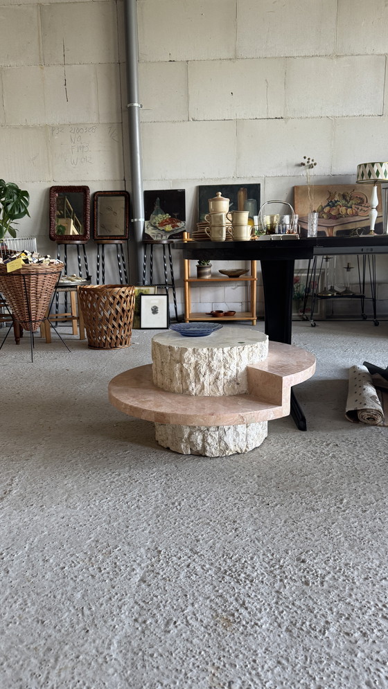 Vintage Mactan Stone Couchtisch von Magnussen Ponte. In der Farbkombination mit beigen und rosa Steinen. In gutem Zustand, passt zu vielen verschiedenen Einrichtungsstilen. Der Marmor/Travertin/Travertin ist ein zeitloses Material, das immer seltener und teurer wird. Der Tisch ist nicht so schwer, wie Sie es erwarten würden. Ein echter Blickfang!