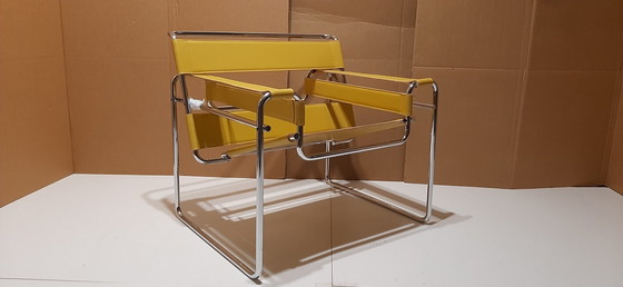 SCHÖNER NEUER- NIE GEBRAUCHTER Sessel Wassily B3 von Knoll, Design von Marcel L. Breuer, Modell aus dem Jahr 1925 (Bauhaus Projekt n3 ). Serie KNOLL Studio. Polsterung aus dickem bernsteinfarbenem Leder. Mannesmann Stahlrahmen in Hochglanz verchromt Dies ist ein Beispiel in AUSGEZEICHNETEM Zustand. Dieses ikonische Stück ist brandneu und wurde nie benutzt. Es wurde nur für das Fotoshooting im Sale aus der Verpackung genommen. Die mitgelieferten rutschfesten thermoplastischen Knöpfe müssen noch angebracht werden. Um eine bessere Garantie für den Endverbraucher zu gewährleisten, wurde die Struktur des Stuhls, die mit dem Boden in Berührung kommt, mit einem transparenten fotografischen Film geschützt. Das Leder und der Stahl sind offensichtlich in ausgezeichnetem Zustand. NB: NEW-MOUCHED Sessel. Die mitgelieferten rutschfesten Stollen aus steifem thermoplastischem Material müssen noch angebracht werden.