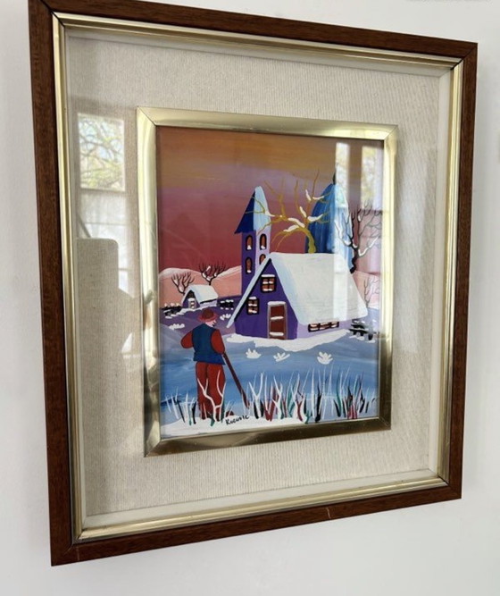 Naives Gemälde des jugoslawischen Malers Kocovic mit einer verschneiten Dorfszene, signiert, im charakteristischen, edlen Rahmen, in sehr gutem Gesamtzustand.