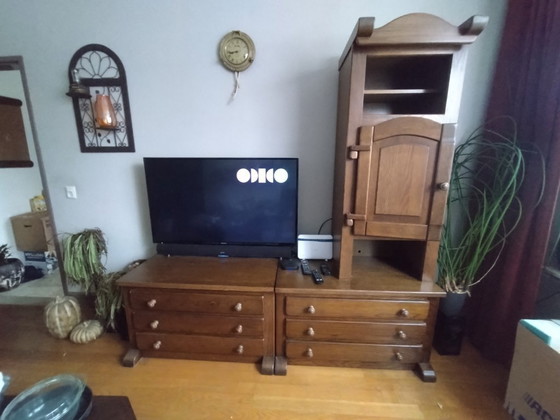 Eine wunderschöne Kombination aus Kommoden und einem Hochschrank. Die Kommoden sind 97 cm breit, 55 cm tief und 58 cm hoch. Der Hochschrank ist 58 cm breit, 42 cm tief und 140 cm hoch. Ideal für zusätzlichen Stauraum im Wohn- oder Schlafzimmer.