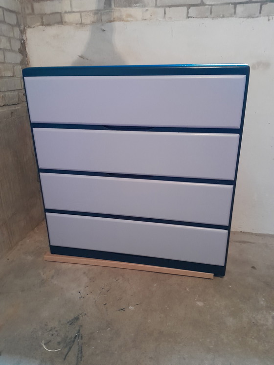 Diese moderne Kommode vereint Stil und Funktionalität mit klaren Linien und frischen Farben. Sie besticht durch ihre auffällige blau-lila Lackierung. Die geräumigen Schubladen bieten viel Stauraum für all Ihre Utensilien.