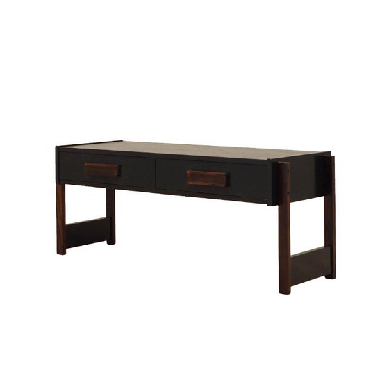 Das Gestell ist mit Palisanderfurnier versehen. Beine und Griffe sind aus massivem Palisanderholz. Die Oberfläche wurde aufgearbeitet. Die Kommode ist ein klassisches Möbelstück und passt ideal in jeden Raum. Dank ihrer zwei geräumigen Schubladen eignet sie sich perfekt zur Aufbewahrung von Dokumenten und Spielzeug im Kinderzimmer oder als Wäscheschrank im Schlafzimmer.