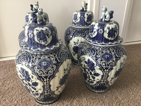 Wunderschöne Royal Sphinx Maastricht Delft Vasenurnen, perfekt für Liebhaber klassischer niederländischer Keramik. Dieses Set aus vier Vasenurnen ist mit traditionellen blau-weißen Mustern verziert und verleiht jedem Interieur zeitlose Eleganz. Ideal als Dekorationsobjekt oder Sammlerstück. Preis pro Stück.