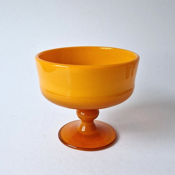 Mundgeblasene orangefarbene Schale auf Fuß.