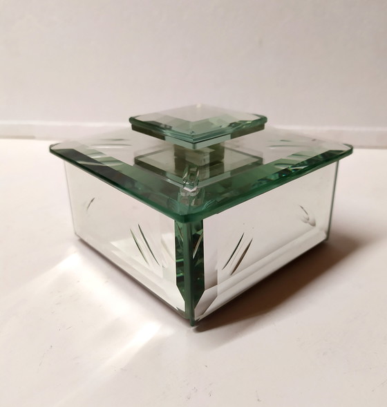 Kristalldose von Pietro Chiesa für Fontana Arte, 1940er Jahre. Dieses schöne grüne Kristallkästchen eignet sich für die Aufbewahrung von Schmuck. Leichte alters- und gebrauchsbedingte Gebrauchsspuren. Die Oberfläche wurde poliert. Unsichtbare kleine Mängel.