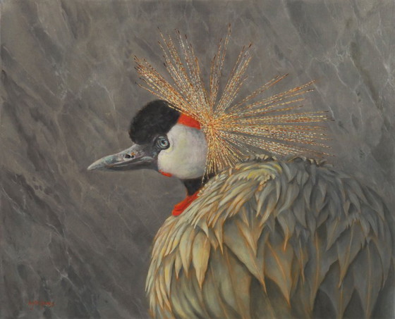 Dieses Meisterwerk zeigt einen Kronenkranich mit unvergleichlicher Finesse und Präzision. Der Künstler fängt das prächtige Gefieder des Vogels wunderschön ein, eine Mischung aus Gold- und Grautönen, die sich zu einer reichen und detaillierten Textur entfalten. Die markante Krone des Kranichs, bestehend aus feinen goldenen Federn, erhebt sich majestätisch und kontrastiert mit seinem schwarz-weißen Gesicht. Der neutrale Hintergrund mit subtilen Nuancen erinnert an eine neblige Landschaft und verleiht dem Ganzen eine ruhige und geheimnisvolle Atmosphäre. Die Komposition hebt das elegante Profil des Vogels hervor und unterstreicht die natürliche Anmut und majestätische Schönheit der Art. Der aufmerksame Blick des Kranichs, der auf einen unsichtbaren Punkt gerichtet ist, verleiht dem Werk Tiefe und Faszination. Dieses Gemälde ist eine Hommage an die Natur, eingefangen mit beeindruckender technischer Meisterschaft und wahrer Kunstfertigkeit. Sylvie Ajacques stammt ursprünglich aus der Region Paris und hat eine angeborene Leidenschaft für das Zeichnen und Malen. Eine Reise nach Simbabwe und eine weitere nach Nepal gaben den Ausschlag für ihren Wunsch, sich der Malerei zu widmen und die Emotionen dieser fernen Länder einzufangen. Ihr Diplom in Dekorativer Malerei aus Paris ermöglichte ihr die Ausübung als Künstlerin für Dekorative Malerei. Anschließend widmete sie sich hauptsächlich der Tiermalerei und Bildhauerei.