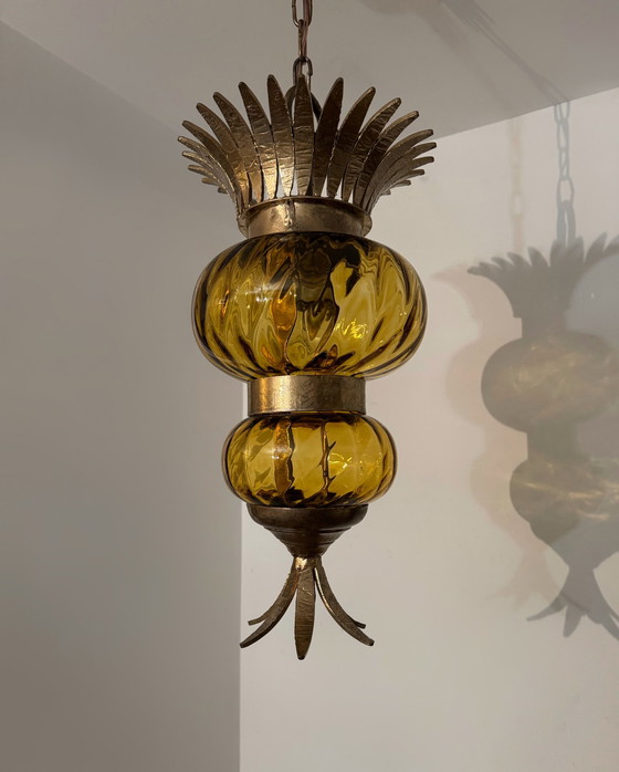 Seltener Kronleuchter, der die Formen einer "Ananas" aufgreift, die in ihrer Mitte aus vergoldetem Metall und mundgeblasenem Bernsteinglas gegürtet ist, im Stil von Hollywood Regency, 70er Jahre, sehr guter Allgemeinzustand, funktioniert mit einer Glühbirne mit großem Sockel Max Höhe: 70cm (mit der Kette nach unten verstellbar) Höhe Ananas allein: 42cm Max Breite: 22,5cm Gewicht: 4kg Schneller und sorgfältiger Versand