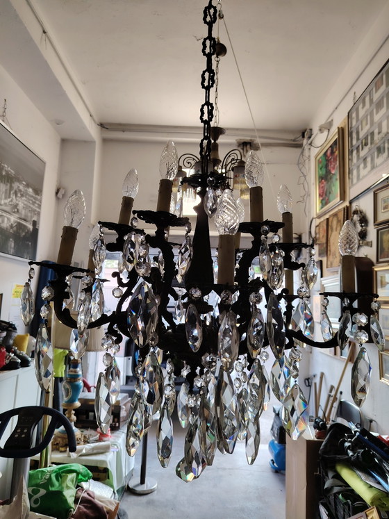 Dieser Kronleuchter aus Bronze und Glas ist ein wahres Beispiel klassischer Eleganz und verleiht jedem Raum einen Hauch von Raffinesse. Seine klaren Kristalltropfen fangen das Licht auf bezaubernde Weise ein und reflektieren es, wodurch eine helle und einladende Atmosphäre entsteht.