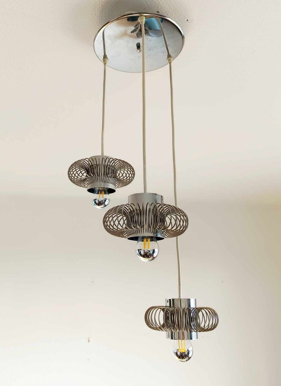 Kronleuchter Kaskade, Space-Age-Stil um 1970 von Philippe Rogier für Oxar. Sogenannter "Wasserfall"-Kronleuchter, bestehend aus drei Pendelleuchten aus verchromtem Metall mit Feder. Flacher runder Pavillon ebenfalls aus verchromtem Metall. Jede Aufhängung ist mit einer Glühbirne mit silbernem Kopf (Sockel e27) versehen. Saubere und funktionale Elektrifizierung. In sehr gutem Zustand 80 x 30 cm Sauberer, schneller und sorgfältiger Versand.