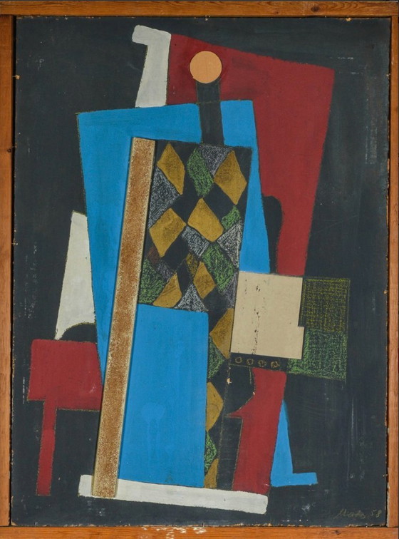 Seite eins - Reproduktion in Mischtechnik, inspiriert von Pablo Picassos Harlekin-Werken. Signiert Mads/Madsen 1958