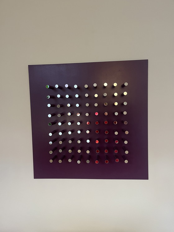 Verwandeln Sie Ihren Wohnraum mit dieser fesselnden Space Age-Wandmalerei. Das auffällige Design besteht aus einem Gitter aus verspiegelten Zylindern, die einen faszinierenden visuellen Effekt erzeugen und jedem Raum einen Hauch von futuristischer Eleganz verleihen.