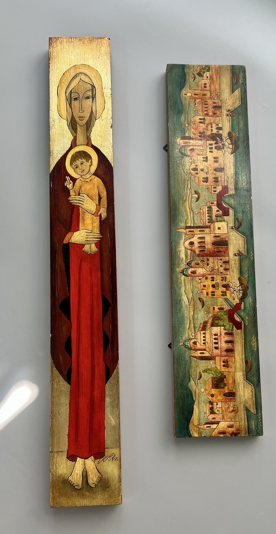 Dieses charmante Konvolut umfasst zwei handbemalte Holzreliefs, signiert mit „Kolz" - mutmaßlich Werke des deutschen Künstlers Kurt Kolz (20. Jahrhundert), bekannt für seine symbolhaften, reduzierten Darstellungen mit spirituellem Unterton.