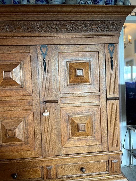 Dieser wunderschöne Eichenschrank, auch bekannt als „Oak Blanket Cabinet“, verkörpert zeitlose Eleganz und robuste Handwerkskunst. Der satte Braunton und die aufwendigen Schnitzereien machen ihn zu einem markanten Stück, das mit seinem klassischen Charme jeden Raum verschönert.